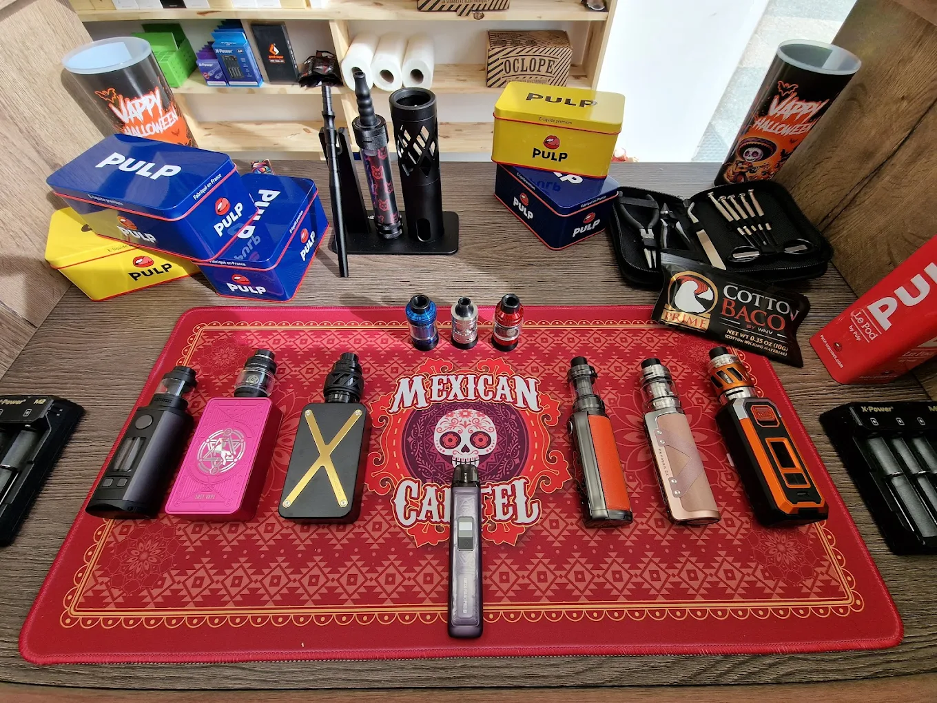 Et pour les adeptes du reconstructible, des RTA et des Drippers ont été choisis pour vous régaler à cotonner. Ainsi qu’une box BF par exemple, pour ne plus avoir à imbiber sans arrêt, et aussi les accessoires et les consommables indispensables : pinces coupantes de précision et à bouts en céramique, coils, coton, brosses et bobines.